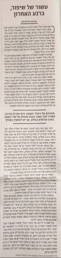 אין ספק כי חייהם של אלפי ניצולי שואה השתפרו לאין ערוך בעשור האחרון, אך חובה עלינו לזכור, כי המשימה לא תמה. גילם הממוצע של ניצולי השואה הוא 84 וכ–14 אלף ניצולים הולכים לעולמם מדי שנה. רבים מהניצולים אינם מודעים לכל הזכויות שמגיעות להם, או מתקשים למצותן. חשוב לזכור שעדיין ישנן עוולות היסטוריות כלפי ניצולי שואה שעלו לארץ אחרי 1953 שצריך לתקן. עשרות אלפי ניצולי שואה עדיין חיים בעוני והזמן אוזל. אין לנו עשור נוסף לשפר את המצב. מה שלא נספיק לעשות עבור הניצולים בשנה הקרובה ייזכר לנו, כחברה, לדיראון עולם.